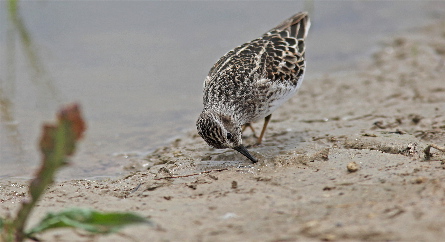 Stilt Sandpiper: Uncommon migrant, usually mixed in with other shorebirds. The first worn adults appear at sewage lagoons in early July. Less frequent along shorelines. Late July and early August adults are in body molt to basic plumage, with some adults completing body molt before departing in mid August, rarely later. The first juveniles appear in early to mid August, with later birds in body molt to first basic plumage. A few young birds stay to mid October. Stilt Sandpipers often associate with Lesser Yellowlegs and Short‐billed Dowitchers. Old‐timers thought that Stilt Sandpipers were hybrids between yellowlegs and dowitchers. Stilts often suggest a dowitcher by plunging their whole head and neck underwater. Their long bill drooped at the tip is a good field mark. Migrants are rarely vocal.